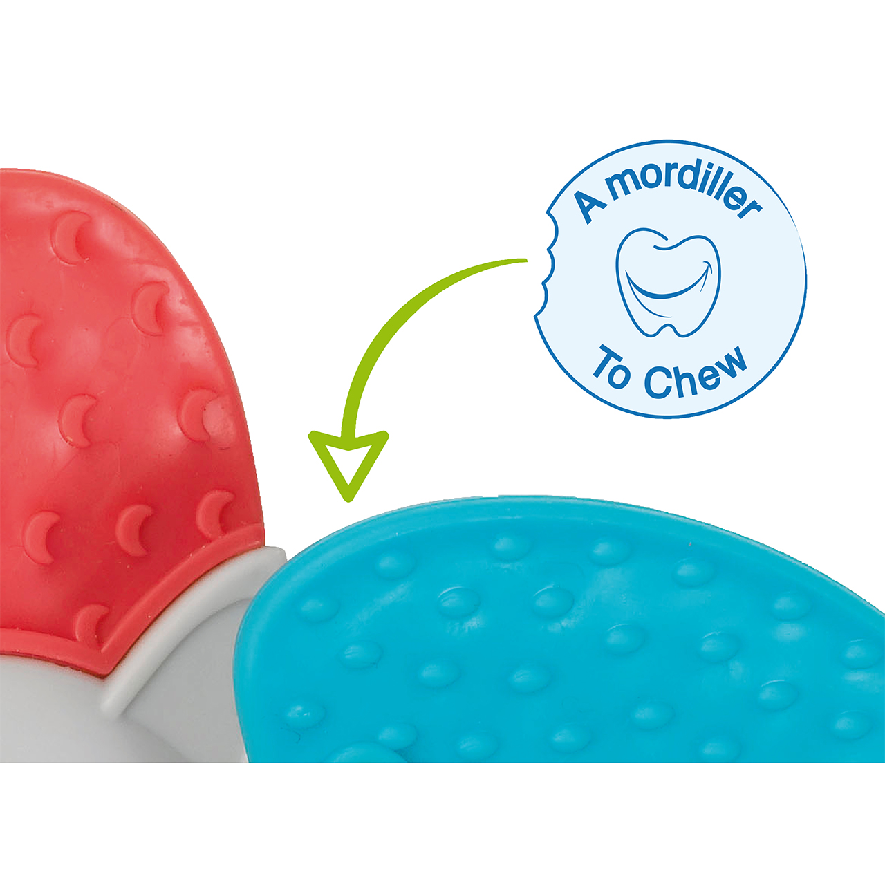 Supple and textured parts designed to be chewed for a gentle massage of painfull gums.